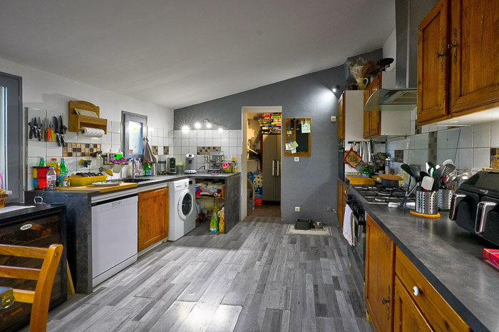 La maison principale, d’une surface d’environ 220 m², s’organise sur deux niveaux. Le rez-de-chaussée est dédié aux pièces de vie, généreuses et lumineuses, ouvertes sur l’extérieur. À l’étage, cinq chambres et deux pièces d’eau offrent un espace nuit confortable, idéal pour une grande famille ou la réception d’invités. Une piscine ainsi qu’un grand garage viennent parfaire le confort de cette demeure.